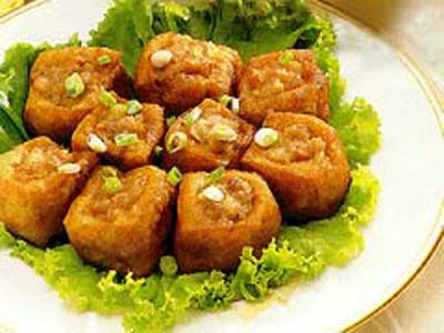 5.熱鍋,倒入適量的油燒熱至180℃時(shí),放入作法4的豆腐,炸至外觀呈金黃色時(shí)撈起瀝油即可。