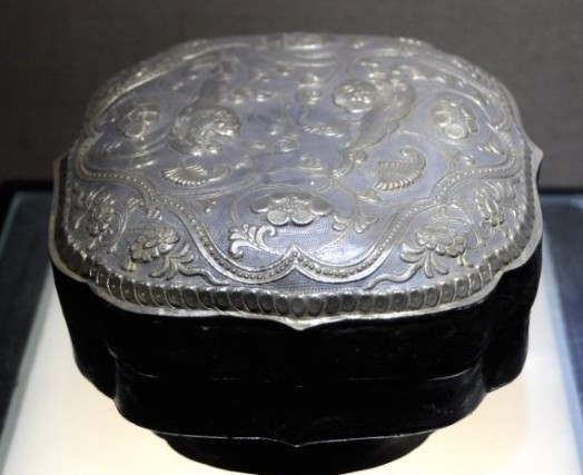 盒高12.0厘米,長17.3厘米,寬16.8厘米。盒體作四出菱弧形,之為直口,直壁,淺腹,平底,喇叭形圈足。鈑金成 型,紋飾鎏金。盒蓋、盒身,上下對稱,以子母口扣合。蓋面隆起,鏨有奔獅、西蕃蓮和蔓草。盒蓋、盒身各鏨一圈二方蓮葉蔓草,并以魚子紋為地。盒底緣鏨一圈蓮瓣紋。它是唐懿宗延慶節(jié)進奉用器。