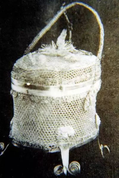 通高15.0厘米,全重335克。有蓋,直口,深腹,平底,四足。蓋為穹頂,籠有提梁,蓋與提梁間有鏈相連。整個籠子用極細的金銀絲編織而成。