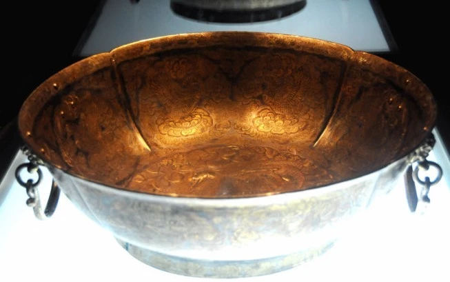 通高14.5厘米,口徑46.0厘米,足徑28.5厘米,足高2.5厘米,壁厚0.6厘米,總重6265厘米。澆鑄成型,紋飾鎏金。盆為葵瓣形侈口,圓唇,斜腹下收,有矮圈足。盆口有一圈蓮瓣紋,盆壁分四瓣,每瓣鏨兩個石榴團花,團花中有一只鴛鴦,還襯有流云和闊葉紋。盆腹內(nèi)外,花紋雷同。盆底有一對嬉戲鴛鴦為中心的石榴團花淺浮雕。圈足微外撇,外飾二十四尕蓮花。