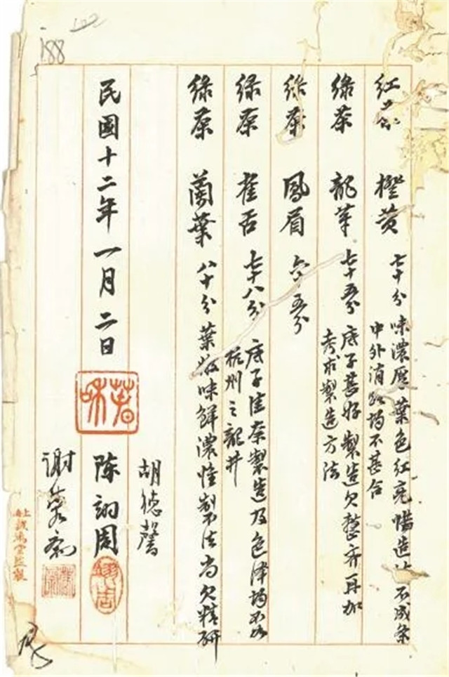 1922年11月,朱文精將實(shí)習(xí)所焙制的5種茶樣交實(shí)業(yè)司,轉(zhuǎn)送上海總商會(huì)延請(qǐng)專家評(píng)定。擔(dān)任上海總商會(huì)展覽會(huì)茶葉審查員的胡德馨、陳翊周、謝蓉齋3位茶業(yè)專家在詳細(xì)查驗(yàn)品評(píng)茶樣后,聯(lián)合出具了報(bào)告書。報(bào)告書記載,5份茶樣,合紅茶1份,綠茶4份,分別是橙黃、龍華、鳳眉、雀舌、蘭葉。其中蘭葉“葉嫩味鮮濃”得分最高,獲得80分??傮w來看,專家們認(rèn)為茶業(yè)實(shí)習(xí)所送評(píng)的茶葉,無論紅茶還是綠茶,茶葉的底子都好,但制法上尚欠精研,還需提高。