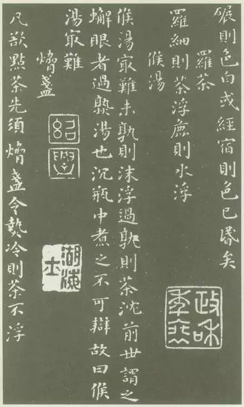 該書作者一直存有爭議,有人認(rèn)為是盧仝,也有人認(rèn)為是《茶寮記》的作者陸樹聲,甚至認(rèn)為是其他人所寫。全書250字左右,分為人品、品泉、煎點、嘗茶、茶候(《徐文長佚草》本作“茶宜”)、茶侶、茶勛七則。