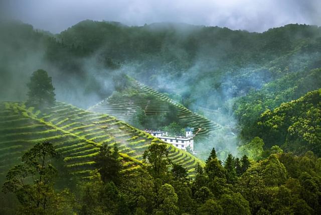 合水鎮(zhèn)鐵山茶場(chǎng)漫山遍野的茶樹沿著梯田整齊排列,煥發(fā)著勃勃生機(jī) 高訊攝