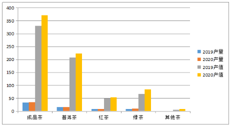 圖11 2019-2020成品茶類產(chǎn)量產(chǎn)值比較圖