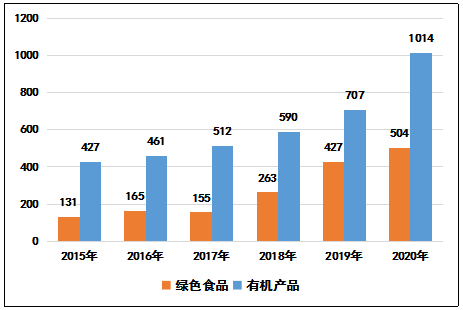 圖10 2015-2020綠色食品及有機產(chǎn)品數(shù)和組織數(shù)比較圖