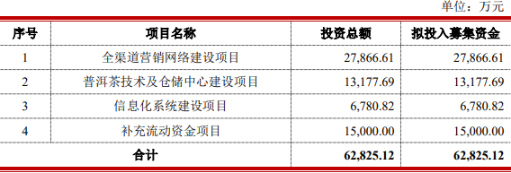 瀾滄古茶原擬在深交所主板公開發(fā)行不超過2000萬股人民幣普通股(A股),占公司本次公開發(fā)行后總股本的比例不低于25%。瀾滄古茶原擬募集資金6.28億元,分別用于“全渠道營銷網(wǎng)絡(luò)建設(shè)項目”、“普洱茶技術(shù)及倉儲中心建設(shè)項目”、“信息化系統(tǒng)建設(shè)項目”、“補(bǔ)充流動資金項目”。