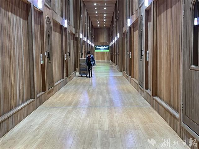 走進(jìn)“洞茶木倉(cāng)”,只見(jiàn)內(nèi)部空間被分割成一間間木屋。透過(guò)木門(mén)上的玻璃,可見(jiàn)木屋內(nèi)堆碼整齊的一箱箱青磚茶成品。木屋內(nèi),保持適宜青磚茶存儲(chǔ)的恒溫恒濕環(huán)境。一個(gè)木屋就是一個(gè)倉(cāng),“洞茶木倉(cāng)”一共48個(gè)倉(cāng),每個(gè)倉(cāng)可存放20噸青磚茶。